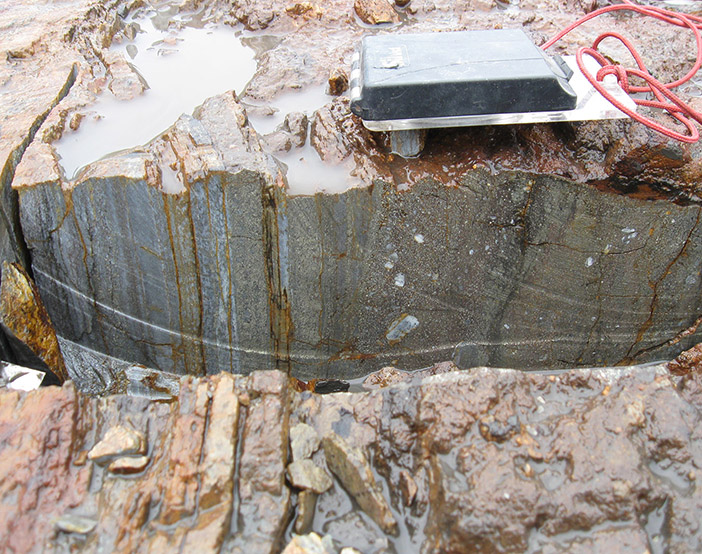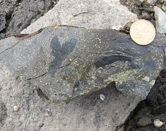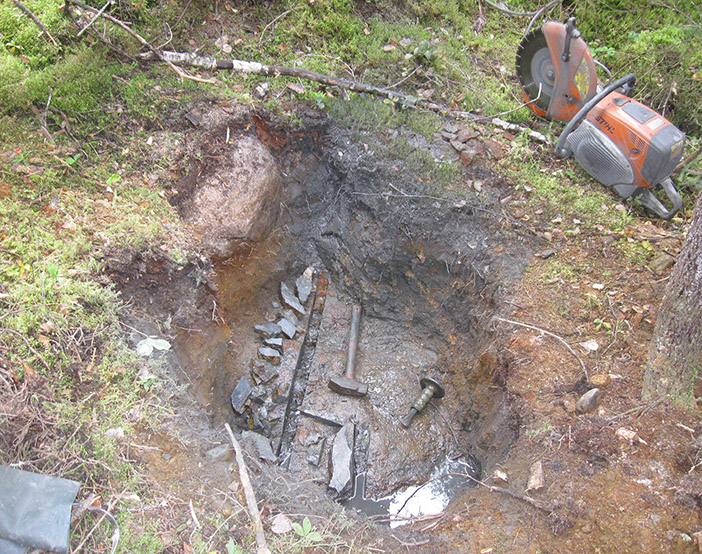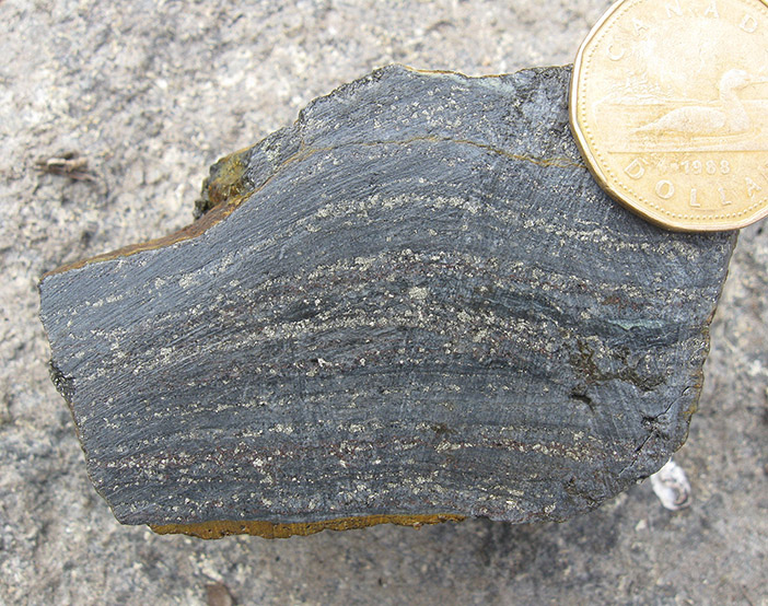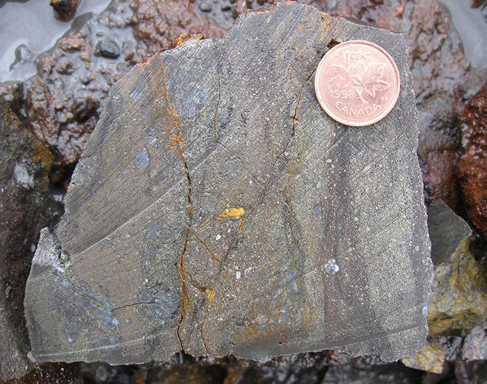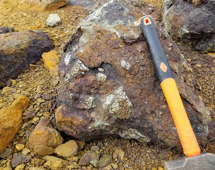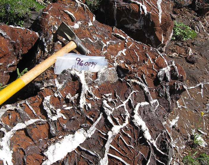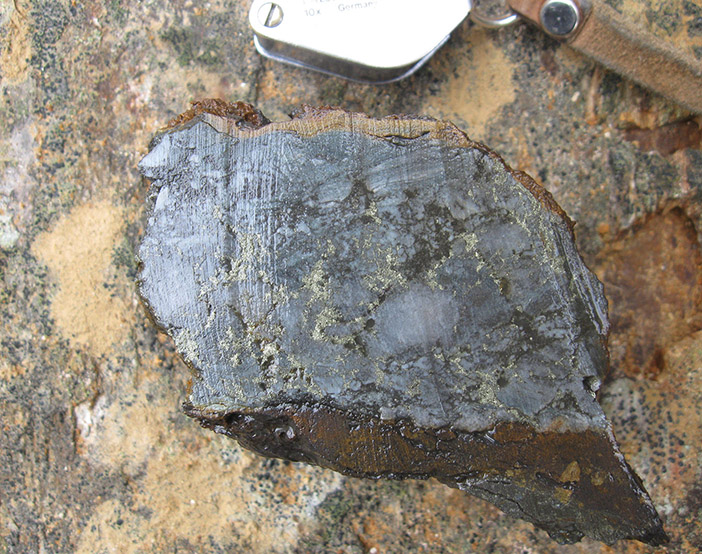 Lentille de sulfures massifs volcanogène exposée en surface: moyenne pondérée de 1.44%Cu, 8.12%Zn, 0.16%Pb sur 0.80m épais et 25m de long. Couvre 7.2km de stratigraphie favorable. Plusieurs autres indices non forés.