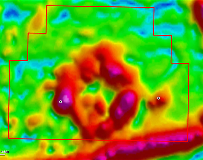 Couvre une anomalie magnétique annulaire typique à 11km ESE du gîte de Terres rares de Montviel. Un bloc de carbonatite et plusieurs blocs de syénites à carbonates en aval glaciaire de la cible.